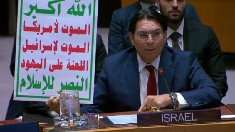 Yaman, FAKTAGLOBAL.COM — Perwakilan tetap musuh Israel untuk Perserikatan Bangsa-Bangsa, Danny Danon, memicu kontroversi pada hari Rabu setelah mengangkat sebuah poster besar bertuliskan slogan Ansarullah yang dikenal sebagai “Al-Sarkha” dalam sebuah sesi Dewan Keamanan PBB.