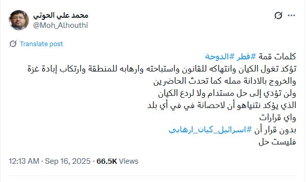 Dalam sebuah unggahan di media sosial pada Minggu malam, al-Houthi menekankan bahwa “keluar hanya dengan kecaman-kecaman membosankan, sebagaimana yang diucapkan peserta KTT Doha, tidak akan menghasilkan solusi berkelanjutan dan tidak akan menggentarkan entitas Zionis.”