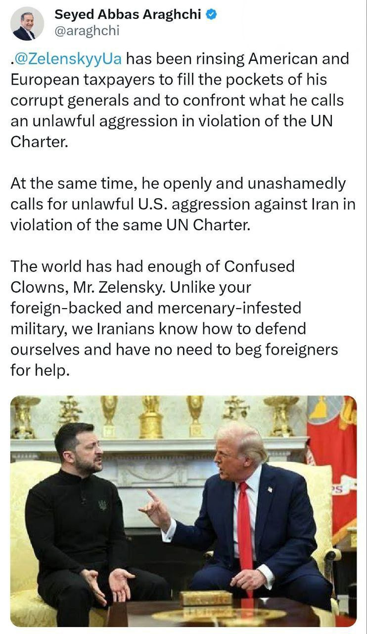 Menteri luar negeri Iran mengecam presiden Ukraina atas kemunafikan dan korupsi, serta mengutuk seruannya untuk agresi ilegal AS terhadap Iran sebagai pelanggaran terang-terangan Piagam PBB