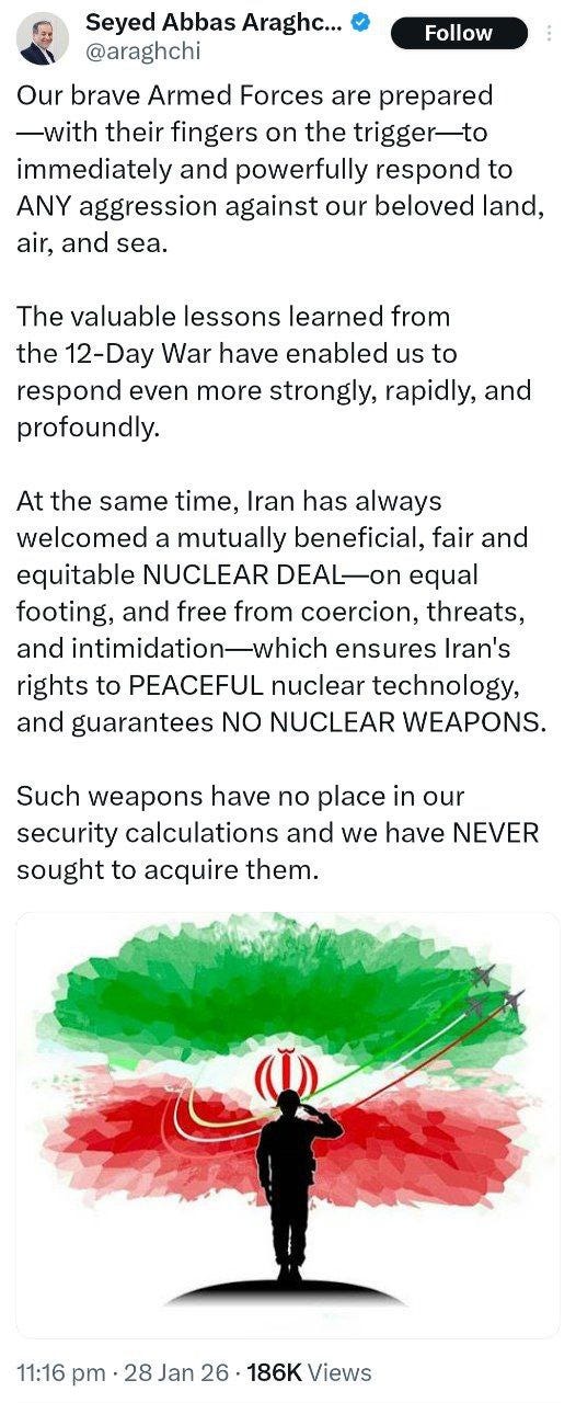 Dalam sebuah pesan yang dipublikasikan melalui akun resmi X miliknya, Araghchi menyatakan bahwa kekuatan militer Iran sepenuhnya siap untuk mempertahankan wilayah darat, ruang udara, dan perairan teritorial negara tersebut dari setiap pelanggaran.