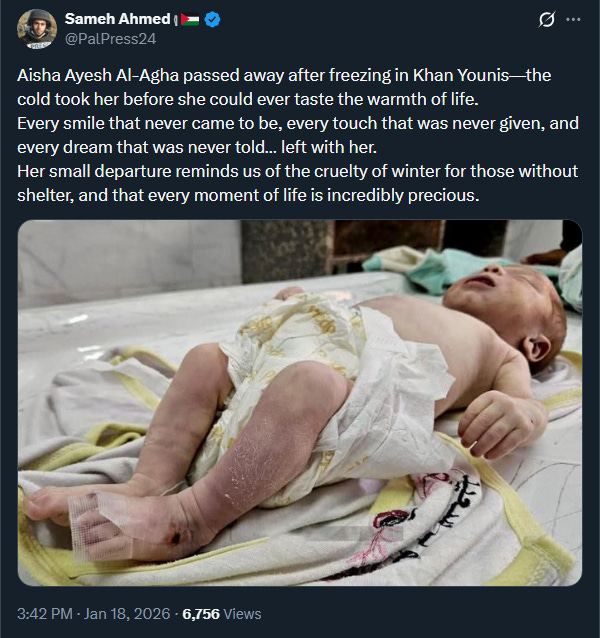 Tenaga medis di Rumah Sakit Nasser di Khan Younis mengonfirmasi bahwa Aisha Ayesh al-Agha, bayi berusia 27 hari, meninggal pada hari Sabtu akibat paparan dingin yang parah. Keluarganya, seperti ratusan ribu warga lainnya, terpaksa hidup tanpa tempat berlindung yang layak di tengah musim dingin, menyusul serangan Israel dan blokade yang berkepanjangan.