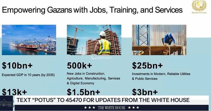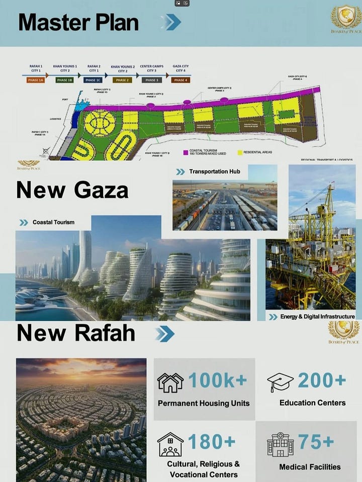 Kushner menyatakan bahwa rencana tersebut akan melibatkan “sejumlah pembongkaran yang diikuti dengan pembangunan Gaza baru yang dapat menjadi sumber harapan”, seraya mengklaim bahwa kota-kota megaproyek serupa telah dibangun dalam tiga tahun di sejumlah negara kawasan—tanpa menyebutkan contoh apa pun.