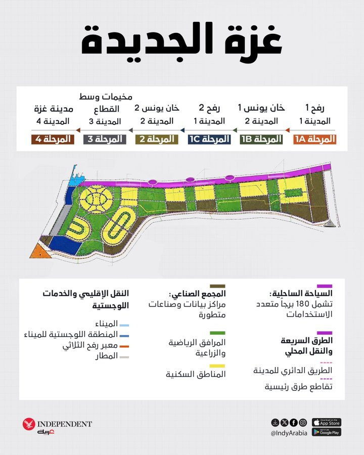 Rencana ini juga membayangkan “Rafah Baru” yang mencakup lebih dari 100.000 unit perumahan, 200 institusi pendidikan, 75 pusat medis, dan 180 fasilitas budaya.