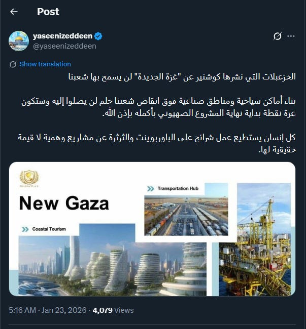 Warga Palestina lainnya menyampaikan kekhawatiran serius bahwa rencana-rencana semacam ini, jika suatu hari diterapkan, justru akan mengokohkan kendali Israel atas Gaza dengan kedok pembangunan dan investasi, alih-alih menghadirkan rekonstruksi atau pembebasan yang nyata.