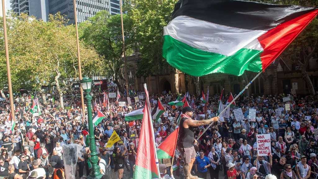 Di Sydney, massa besar berkumpul di Town Hall sambil mengibarkan bendera Palestina, membawa poster-poster protes, dan meneriakkan slogan-slogan yang diiringi tabuhan drum. Polisi dikerahkan dalam jumlah besar sepanjang aksi berlangsung.