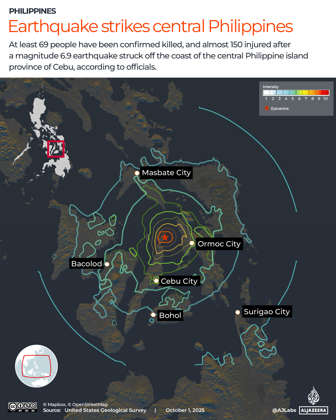 Sedikitnya 69 orang tewas, lebih dari 140 terluka saat Provinsi Cebu porak poranda; otoritas menetapkan status darurat dan meluncurkan operasi penyelamatan besar-besaran.
