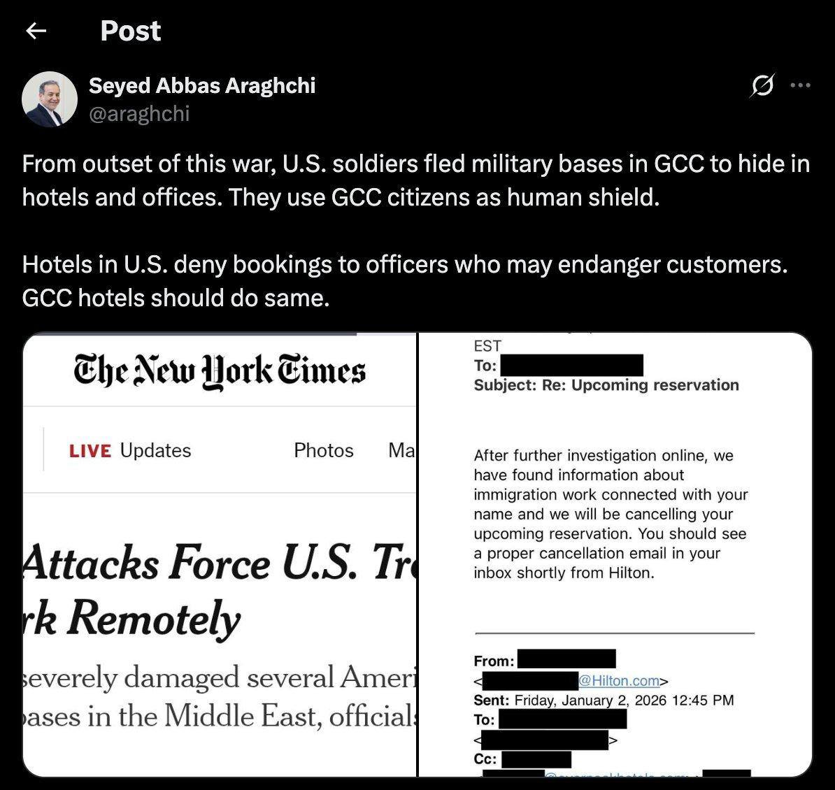 Ia juga menekankan bahwa hotel-hotel di Amerika Serikat tidak memberikan layanan kepada personel militer yang berpotensi membahayakan keselamatan tamu, dan menyerukan agar negara-negara Teluk menerapkan kebijakan yang sama dengan menolak memberikan layanan kepada pasukan Amerika.
