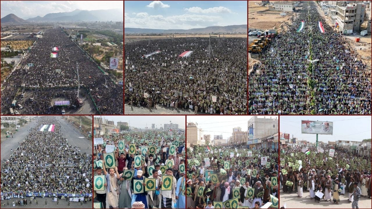 Dalam sebuah pemandangan langka dari keyakinan dan kesadaran kolektif, massa membanjiri lebih dari 1.500 alun-alun dengan slogan “Mobilisasi dan Kesiapsiagaan Umum… Membela Al-Qur’an dan Palestina,” di ibu kota Sana’a dan di seluruh provinsi bebas Yaman.