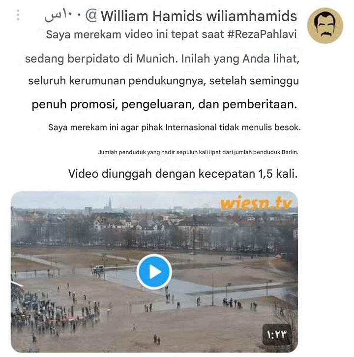 Bukti visual, analisis spasial, dan perbandingan berbasis AI membongkar klaim jumlah massa yang dibesar-besarkan, serta menyingkap kegagalan mobilisasi Munich oleh Reza Pahlavi