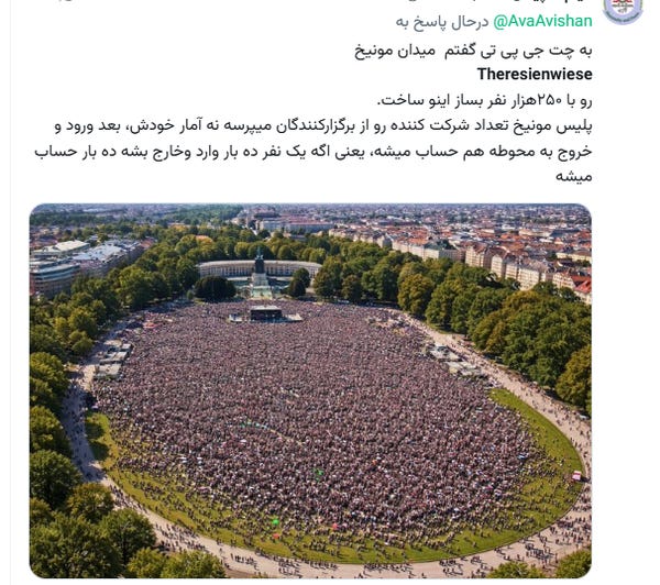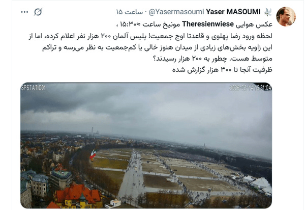 Media asing dan anti-Iran mengklaim bahwa hingga 250.000 pendukung monarki berkumpul di Theresienwiese, salah satu lokasi terbuka terbesar di Munich.