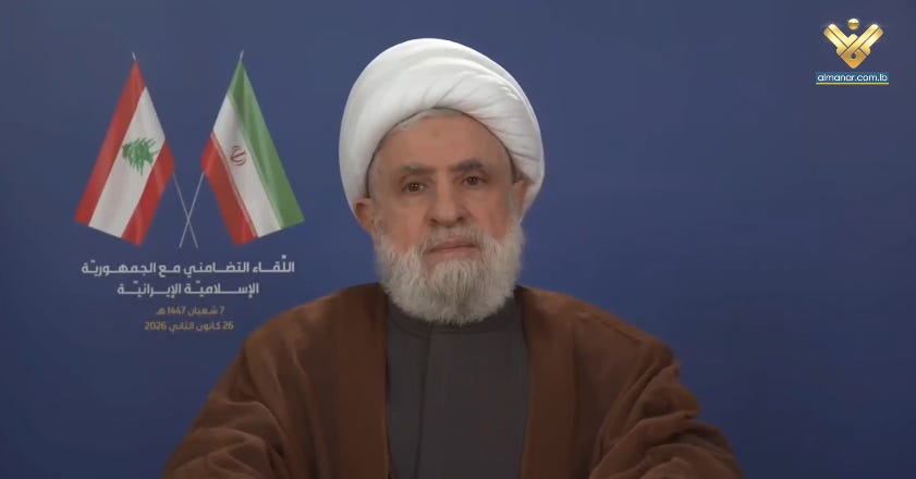 Sheikh Qassem memperingatkan bahwa Iran, Lebanon, Gaza, dan Suriah merupakan medan-medan dalam satu proyek kolonial AS–Israel yang sama, yang bertujuan menghancurkan perlawanan di seluruh kawasan.