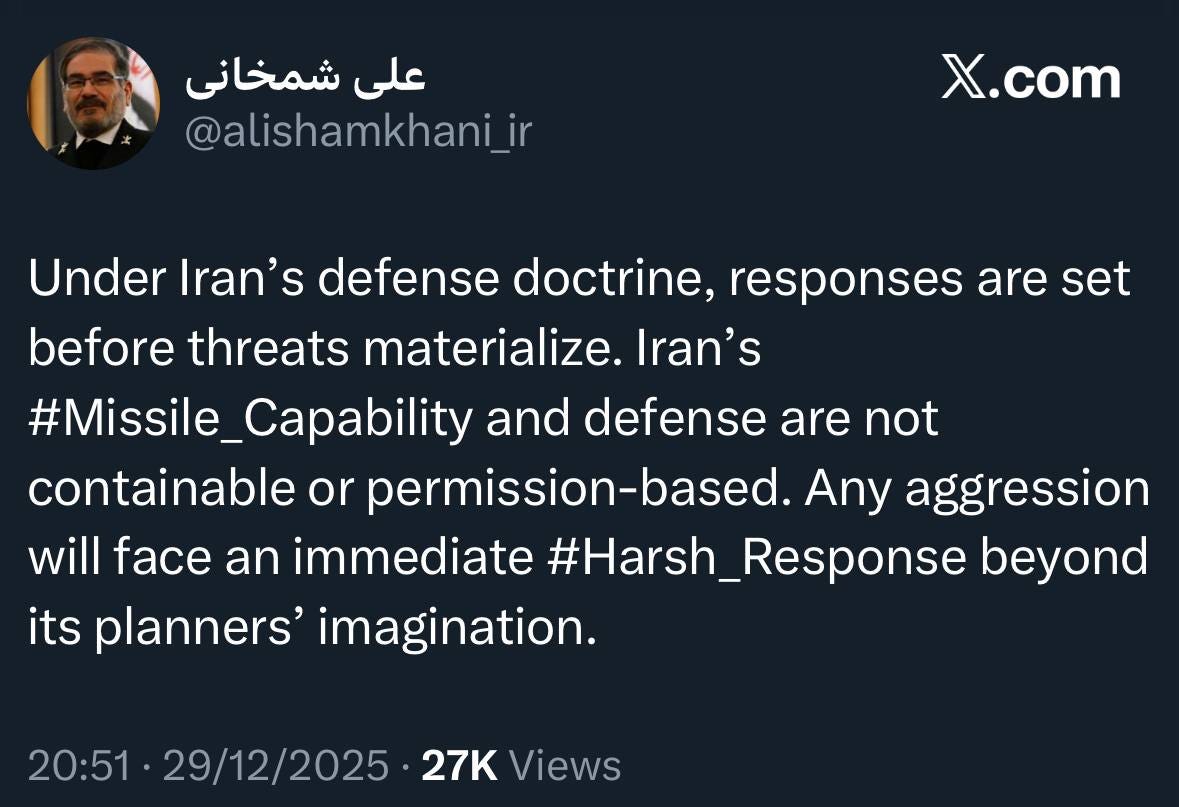 Shamkhani menyatakan bahwa doktrin pertahanan Iran memungkinkan respons sebelum ancaman benar-benar terealisasi, seraya menekankan bahwa daya tangkal direncanakan jauh hari, bukan bersifat reaktif setelah serangan terjadi.