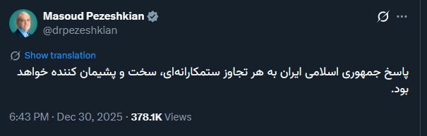 Dalam sebuah unggahan yang dipublikasikan pada Selasa di akun X resminya, Pezeshkian menulis: