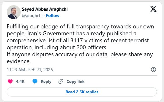 Dalam unggahan di platform X, Araghchi menyatakan bahwa pemerintah Iran telah merilis data resmi korban dan menegaskan bahwa siapa pun yang mempersoalkan angka tersebut harus membuktikan klaimnya dengan bukti.