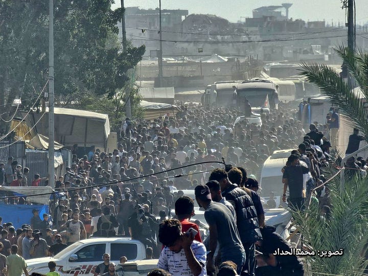 Di Khan Younis, massa dalam jumlah besar berkumpul menyambut para tahanan yang dibebaskan, mengibarkan bendera Hamas dan Jihad Islam sebagai bentuk perayaan yang dipandang banyak orang sebagai kemenangan atas keteguhan dan perlawanan.