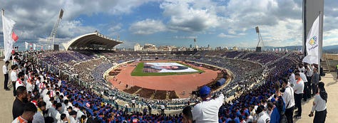 Sebuah potret raksasa Sayyed Hassan Nasrallah berdiri di tengah stadion, sementara para anggota kepanduan mengibarkan bendera Lebanon, Palestina, Iran, dan Yaman secara serempak — sebuah pernyataan tentang nilai-nilai bersama: martabat, pembebasan, dan pengorbanan.