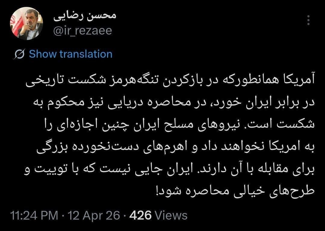 Anggota Dewan Penentuan Kebijakan, Mayor Jenderal Mohsen Rezaei, menegaskan bahwa “Amerika Serikat akan gagal dalam setiap upaya memberlakukan blokade laut, sebagaimana kegagalannya terkait Selat Hormuz sebelumnya.”