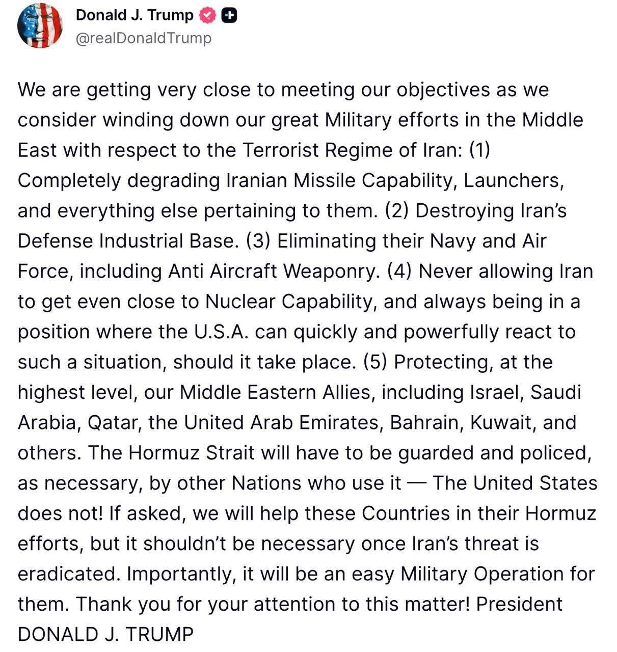 Dalam unggahannya, Donald Trump merinci lima tujuan utama operasi militer AS terhadap Iran, di antaranya: