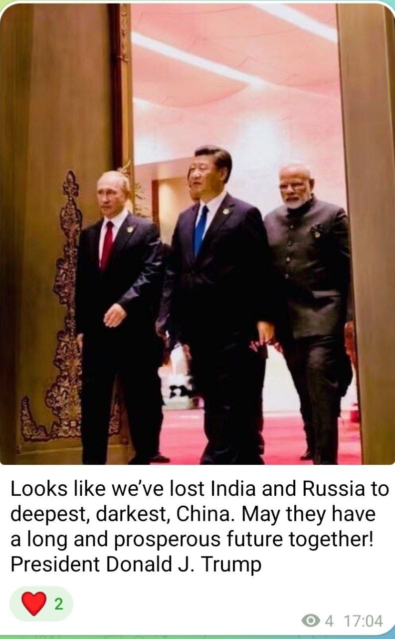 Melalui platform media sosialnya, Truth Social, Trump membagikan foto bersama Putin, Xi, dan Modi, dengan keterangan: “Sepertinya kita telah kehilangan India dan Rusia ke China. Saya berharap mereka memiliki masa depan yang panjang dan makmur bersama.”