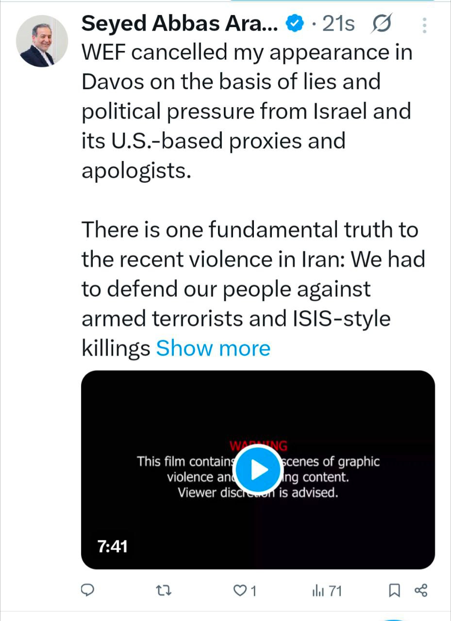 Postingan dokumenter tersebut menyoroti operasi teror sekaligus mengecam moralitas selektif Davos setelah Menteri Luar Negeri Iran dilarang hadir.
